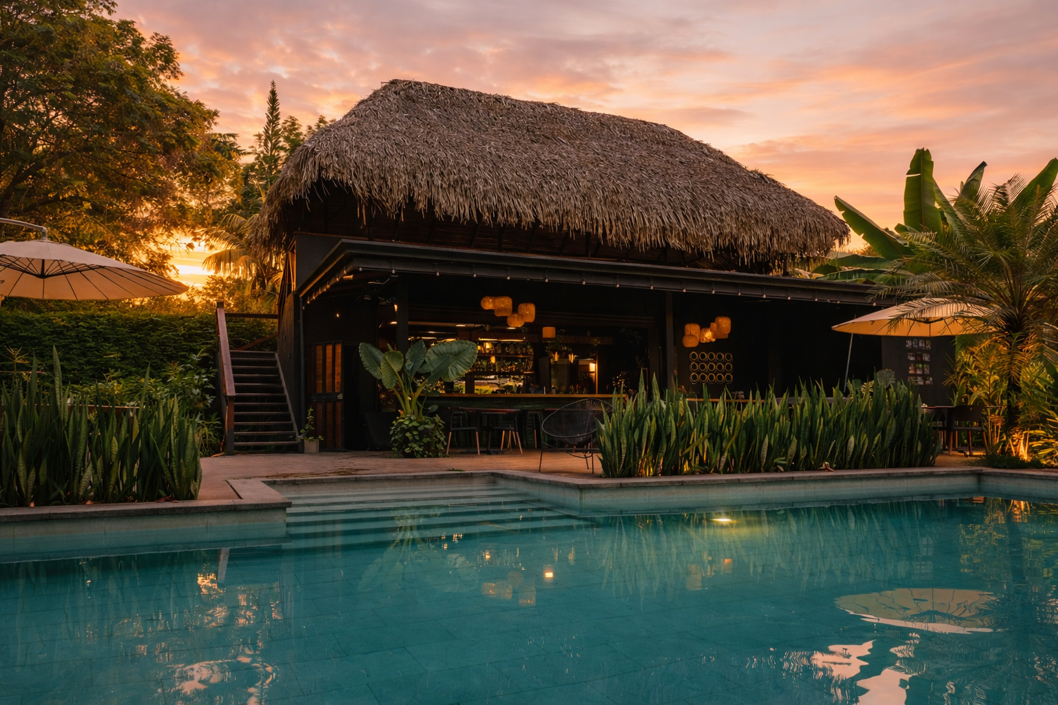 Breakfast is served at the poolside bar with an open air second floor to take in the expansive jungle view against a backdrop of the lush mountainous hillside.